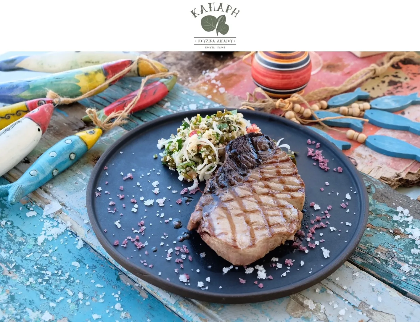 Στην ΚΑΠΑΡΗ θα δοκιμάσετε φρέσκο χταπόδι με κριθαράκι, σαλατουρι φτιαγμένο με καλκάνι και συνταγή του ψαρά παππού μας, σαλιγκάρια με ντομάτα και κρεμμύδια, χοιροβοσκους και κριταμο τουρσί, παραδοσιακή ρεβυθαδα ψημένη στο τσουκαλι κ. α.