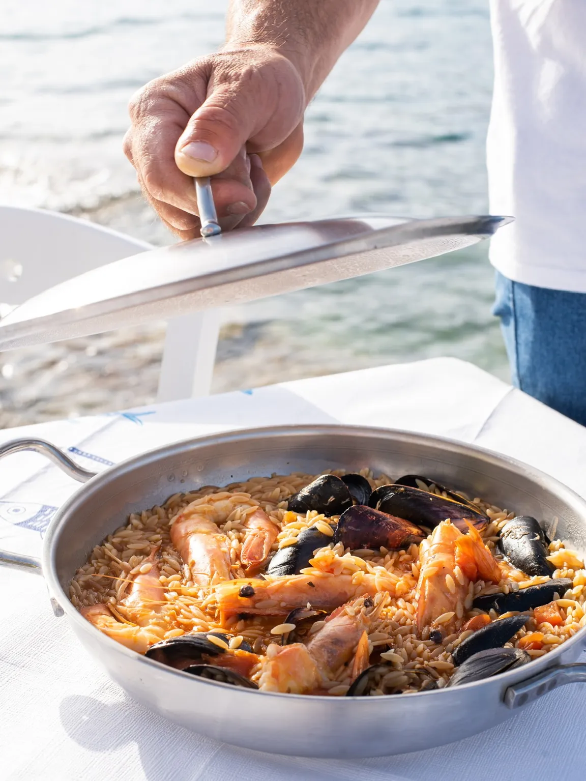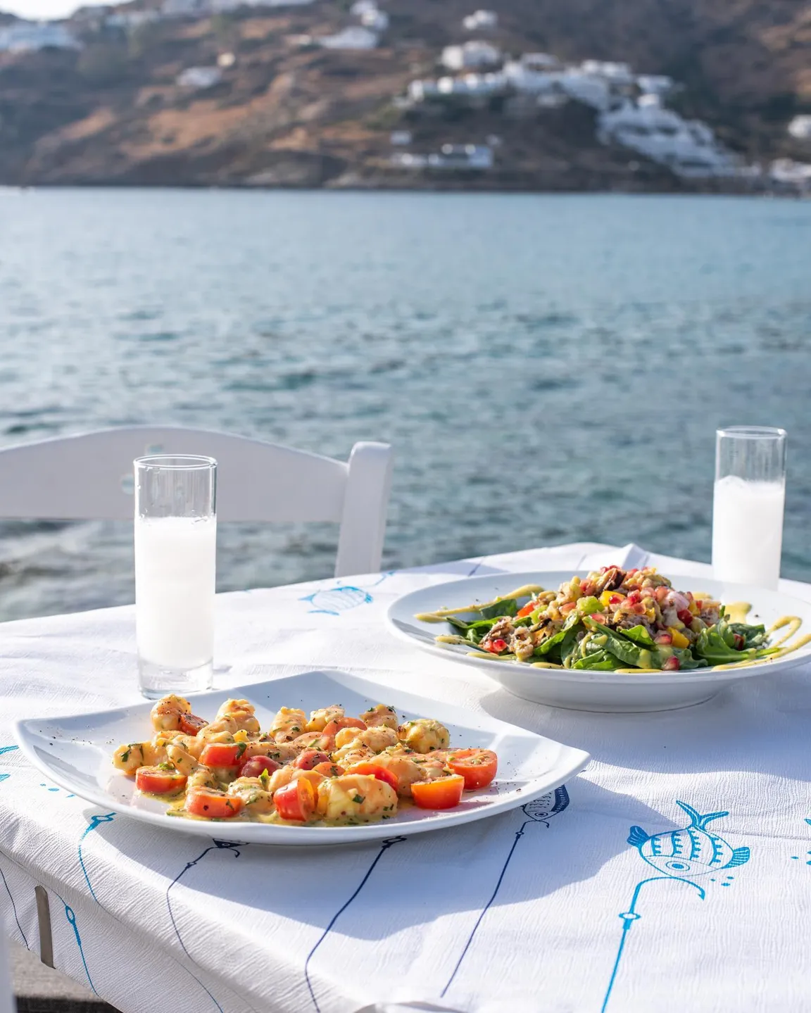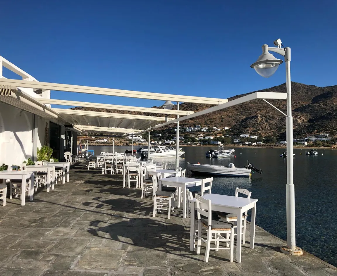 Στον πλούσιο κατάλογο των εδεσμάτων με τα ελληνικά φαγητά και, τους θαλασσινούς μεζέδες ξεχωρίζουν τα ολόφρεσκα ψάρια που μας προμηθεύουν καθημερινά οι Νιώτες και οι Καλύμνιοι ψαράδες τα οποία ψήνονται στα κάρβουνα, η αστακομακαρονάδα, το γιουβέτσι με γαρίδες και μύδια (κορυφαίο πιάτο), η μαρινάρα, το χταποδάκι που το μαγειρεύουμε με τέσσερις ξεχωριστούς τρόπους, το τηγανιτό ρύζι με θαλασσινά, η ψαρόσουπα και οι νησιώτικοι ρεβυδοκεφτέδες. Όλα αυτά συνοδεύονται από το πολύ καλό Κυκλαδίτικο χύμα κρασί ή το παραδοσιακό καραφάκι ούζο από το Πλωμάρι της Λέσβου.