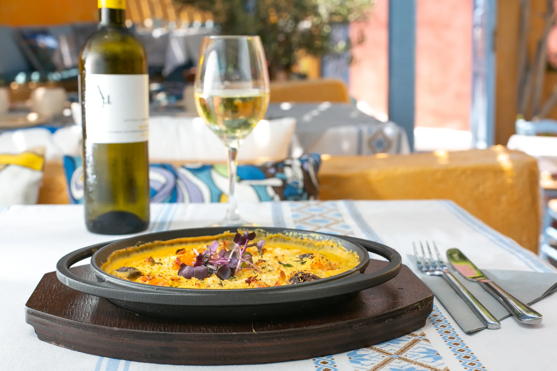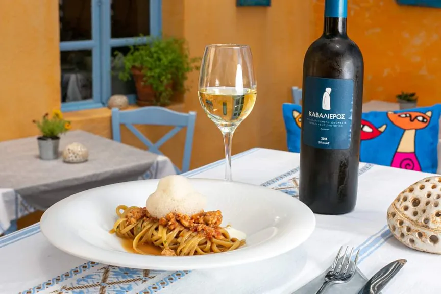 Στόχος μας είναι η ανάδειξη της καλής ελληνικής κουζίνας και των προϊόντων της ελληνικής γης και ο συνδυασμός με εκλεκτούς ελληνικούς οίνους, σε προσιτές τιμές. Οι οινικές προτάσεις στο εστιατόριό μας, και από την υπόλοιπη Ελλάδα είναι πολλές , αλλά έμφαση δίνουμε στα μοναδικά κρασιά της Σαντορίνης φρέσκα ή παλαιωμένα, με εξαιρετικό χαρακτήρα, τα οποία συνοδεύουν με τον καλύτερο τρόπο τα περισσότερα πιάτα της ελληνικής κουζίνας.