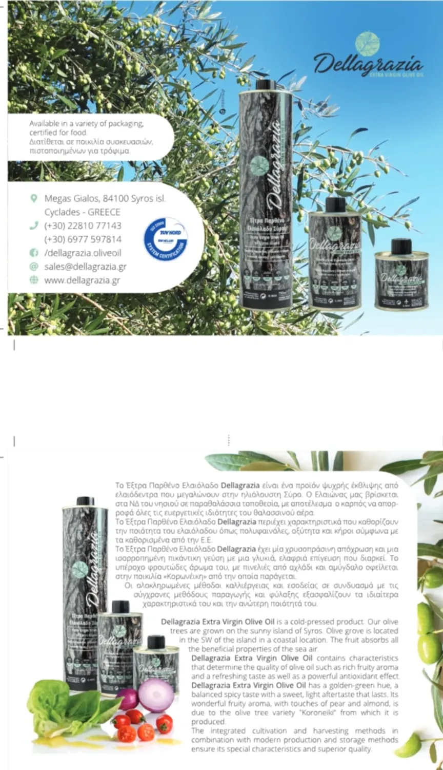 Το Εξτρα Παρθένο Ελαιόλαδο Dellagrazia είναι ένα προιόν ψυχρής έκθλιψης από ελαιόδενδρα που μεγαλώνουν στην ηλιόλουστη Σύρο. Ο ελαιώνας μας...