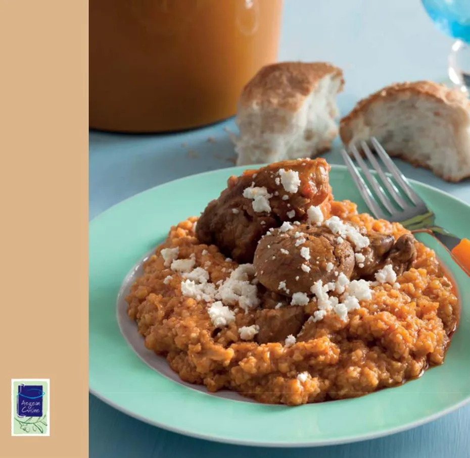 Στη συνέχεια, αποσύρουμε το σκεύος από τη φωτιά, προσθέτουμε το υπόλοιπο ελαιόλαδο, λίγο τριμμένο τυρί και ανακατεύουμε. Βάζουμε και το κρέας στην κατσαρόλα με τον χόντρο και το πασπαλίζουμε με λίγο πιπέρι και το υπόλοιπο τριμμένο τυρί.